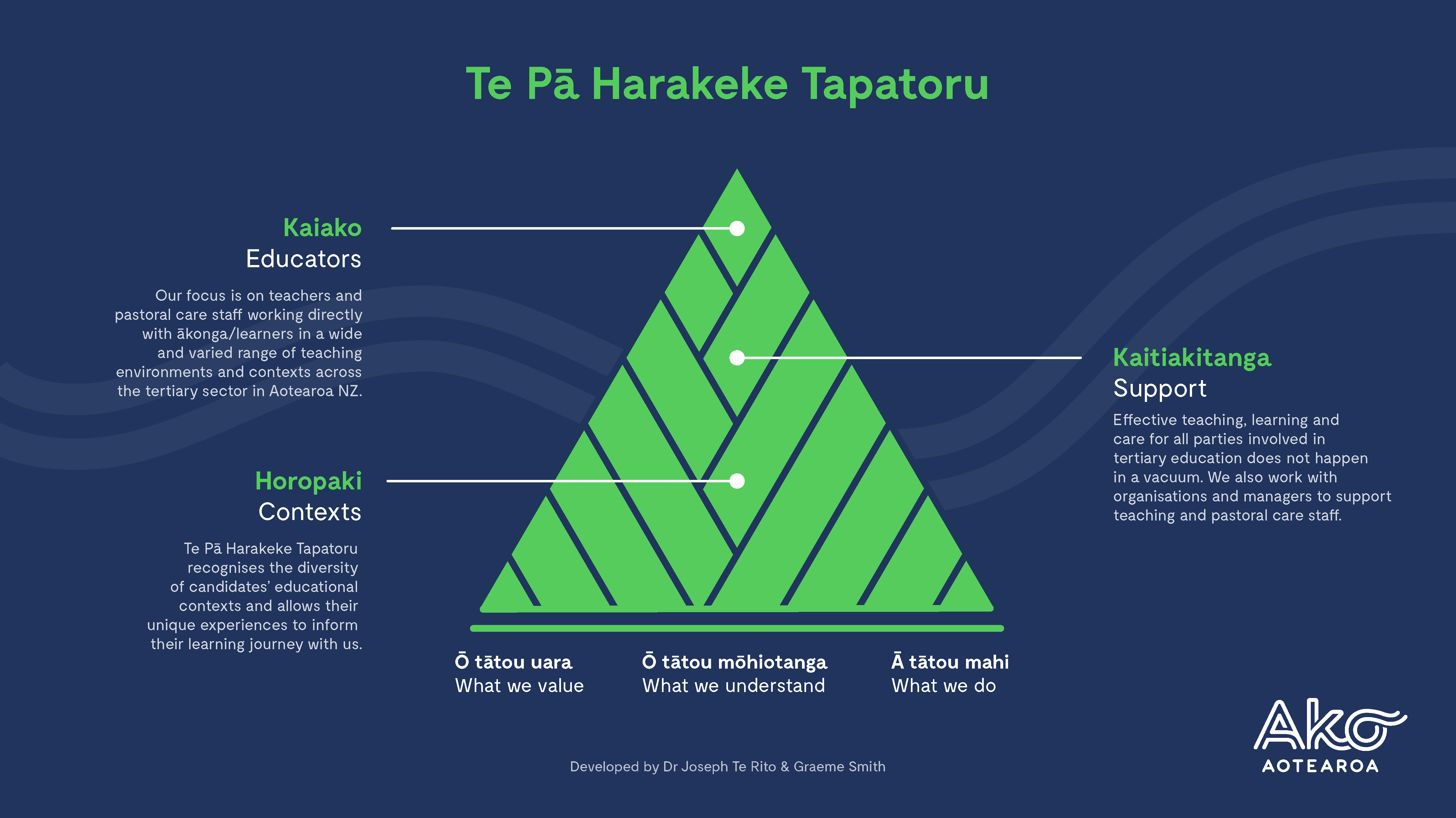Te Pā Harakeke Tapatoru is the metaphorical model that underpins the Tapatoru Ako Professional Practice Award. The naming of this award arises from whakataukī (metaphors) relating to harakeke (flax) and the values 'espoused' by two interwoven whakataukī.